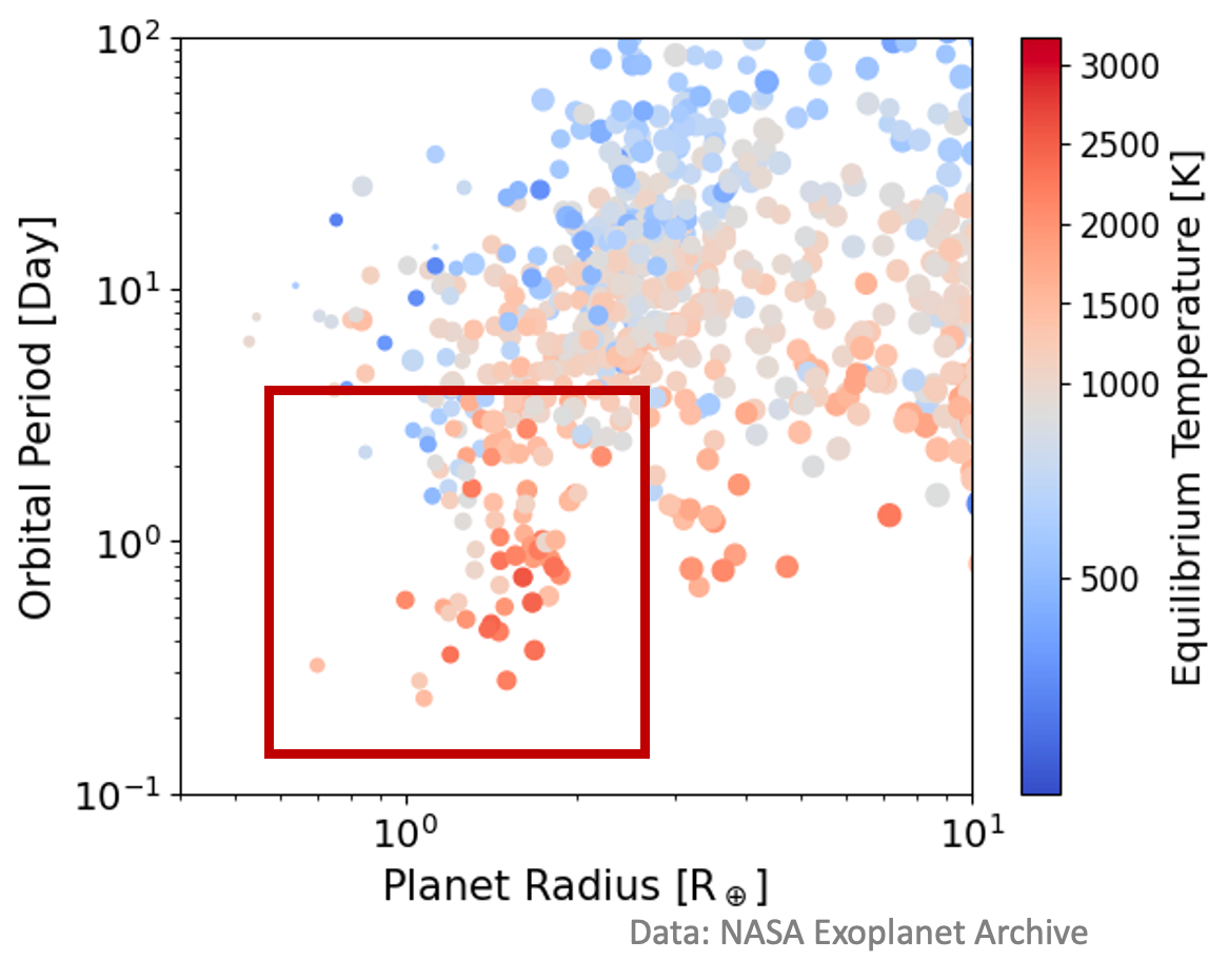 Orbital periods and radii of confirmed exoplanets as of May 2025. The planets located in the red box are rocky exoplanets with ultra-short orbital periods. The color of each point represents the equilibrium temperature of the planet, ranging from 500 to 3,000 K.