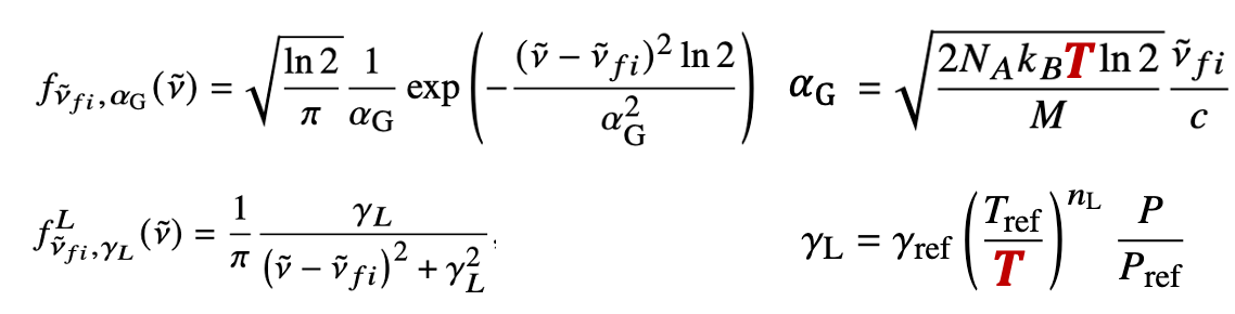Gaussian and Lorentz profile for absorption line broadening calculations.The coefficients of determination αG (half-width at half-maximum) and αL strongly depends on temperature (highlighted in red). More information on HITRAN.